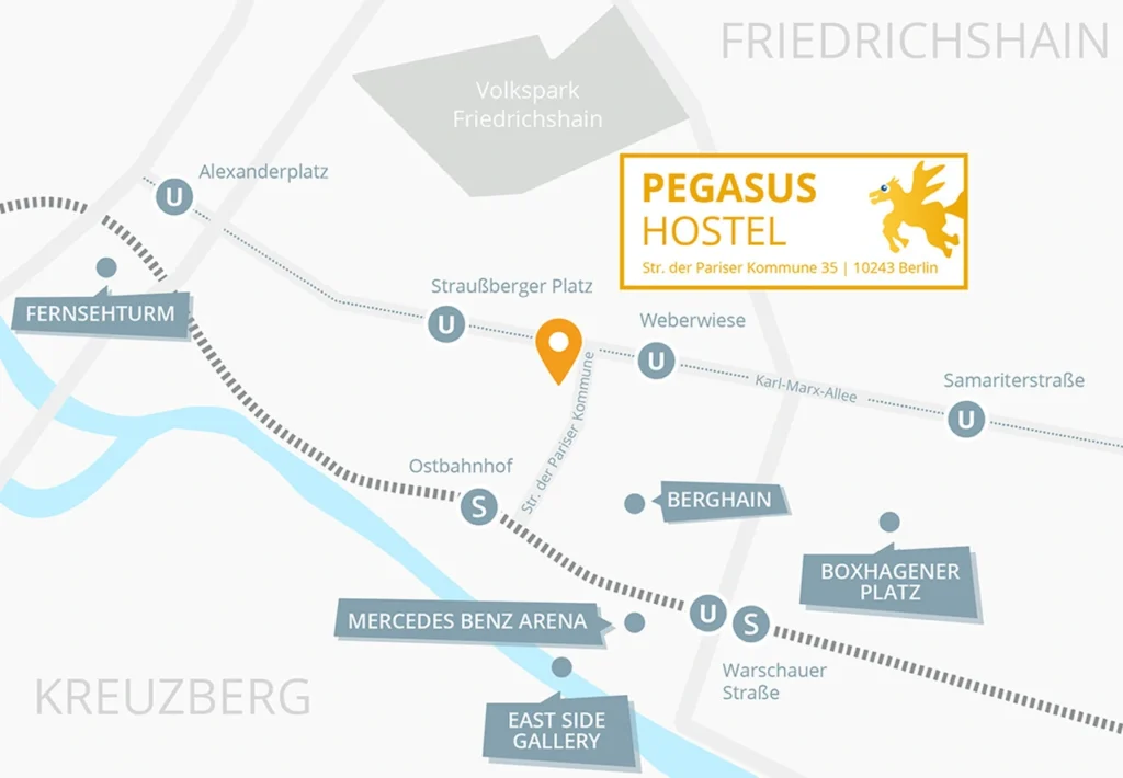 Das Pegasus Hostel Berlin liegt zentral in der Straße der Pariser Kommune, eingebettet zwischen der Karl-Marx-Allee mit dem U-Bahnhof Weberwiese und dem Ostbahnhof.